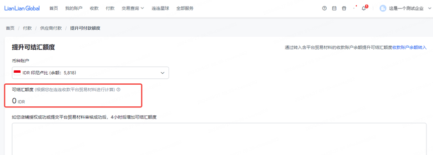 点击【付款】-【供应商付款】,在【币种/店铺余额账户】一栏,点击【提升额度】,可查看对应币种的可结汇额度。若可结汇额度≤付款金额,则需先提升可结汇额度,再进行付款。