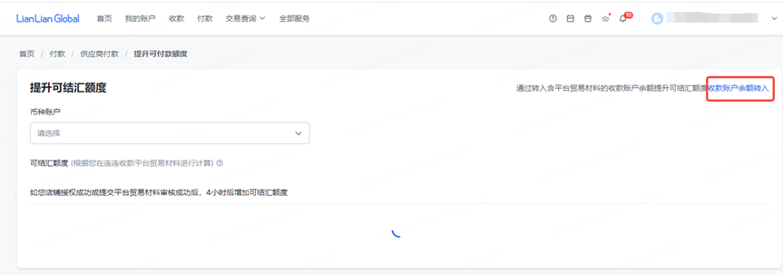 B. 点击【付款】-【供应商付款】,在【币种账户余额】一栏,点击【提升额度】,点击【收款账户余额转入】,转入含平台贸易材料的收款账户余额提升可付款额度