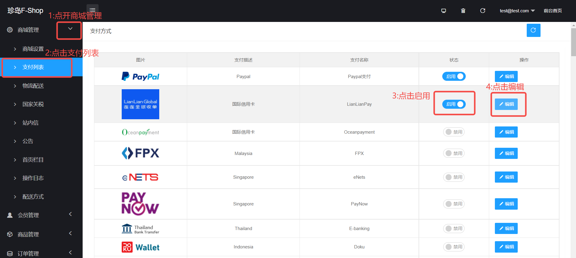 1、登录珍岛商城后台,点开商城管理,点击支付列表;在右侧界面中找到LianLianPay,点击启用,点击编辑