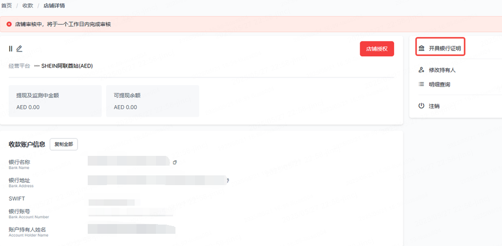 SHEIN阿联酋站绑定收款账户时,需要提供银行证明。请在店铺详情页面右侧点击【开具银行证明】进行申请,审核成功后,可以在店铺详情页下载银行证明,用于SHEIN阿联酋站店铺收款账户绑定。