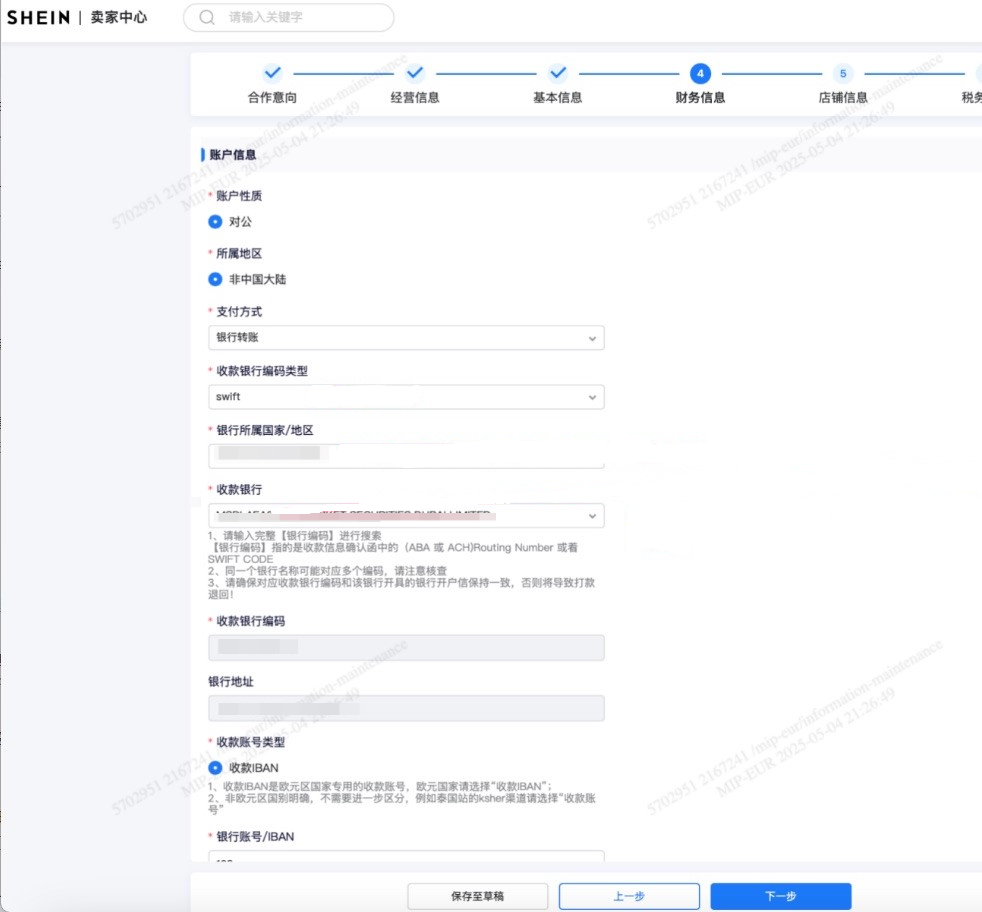 收款账户名称:填写与SHEIN平台注册主体一致的名称