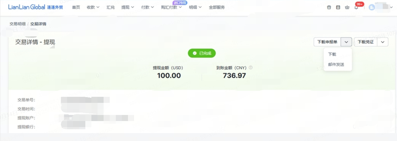 12若您提现资金时选择需要退税的,可进入该笔提现单详情页,直接下载【外汇收入申报单】。(申报单一般需要5个工作日的时间开出)