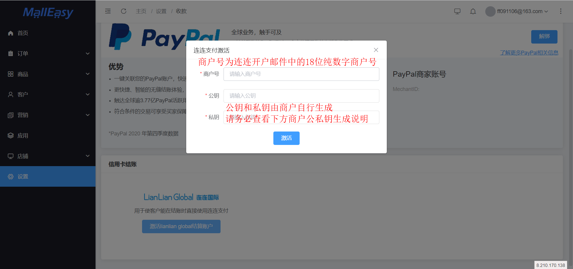 2、点击【激活LianLian global结算账户】后,页面如下图所示,请填写商户号、公钥、私钥信息。