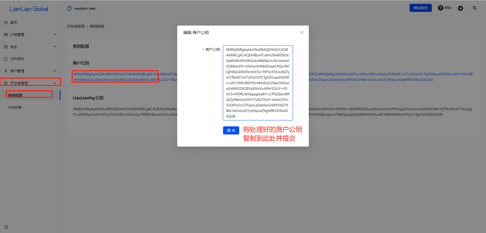 商户公钥配置:将待处理的商户公钥做如下处理,删除开头的“-----BEGIN PUBLIC KEY-----”和末尾的“-----END PUBLIC KEY-----”,并将每行的换行去掉(如下图),最后生成一个长串(确保头、尾的空格也已删除),复制经过处理后的商户公钥,将其复制到连连全球收单商户站后台的秘钥->商户公钥 以及海卖通商户后台->设置->收款->激活LianLain global结算账户的公钥中。(注:去除换行、回车、空格可以使用第三方在线工具一键处理,避免人工出错,百度搜索“在线去除回车、换行、空格”)