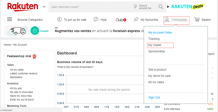 ①在店铺后台完成登录后鼠标移动至红框,点击My Wallet。