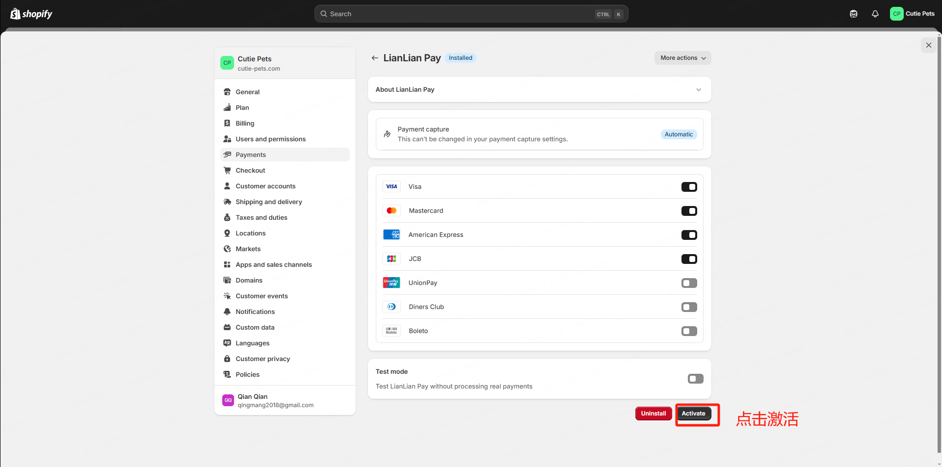 4、选择连连已经为您开通的支付方式(如果不清楚如何选择,请咨询客户经理或者客服),然后点击Activate LianLian Pay正式开启收款。