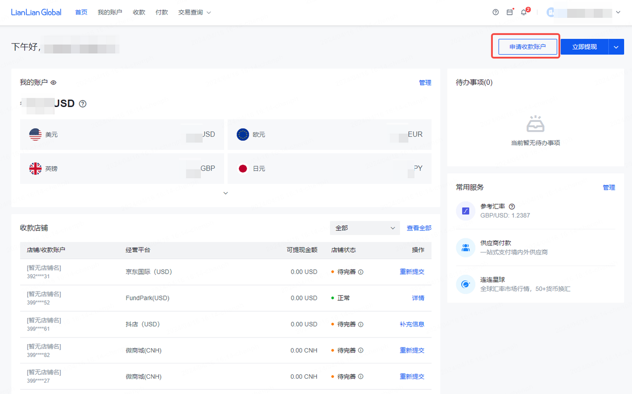 Step1:登录连连国际官网,注册连连国际账户并完成实名认证后,选择申请收款账户。