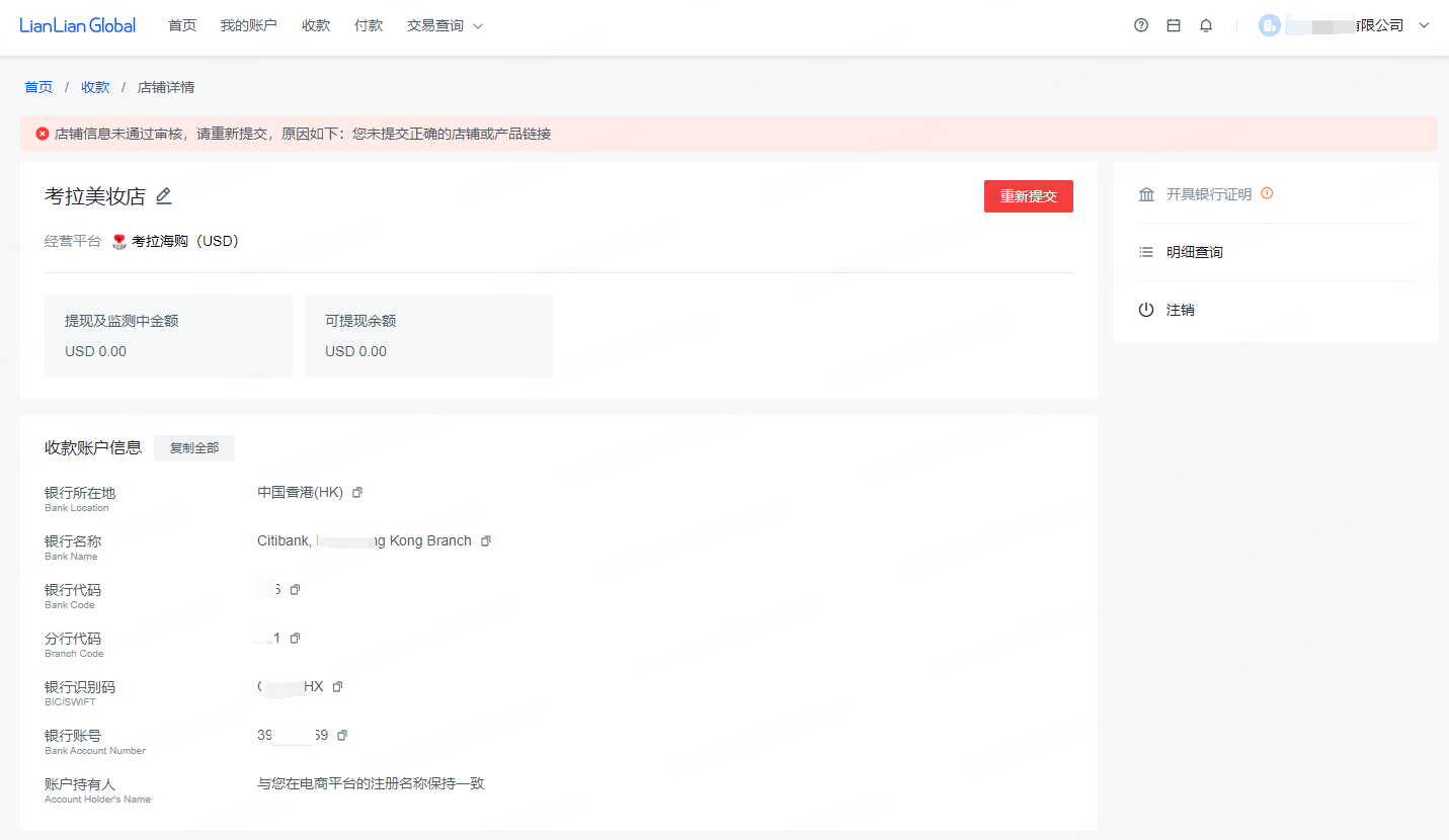 Step3:确认店铺信息无误后点击提交,即可发放和查看收款账户信息,提交的店铺信息最快1个工作日内完成审核。