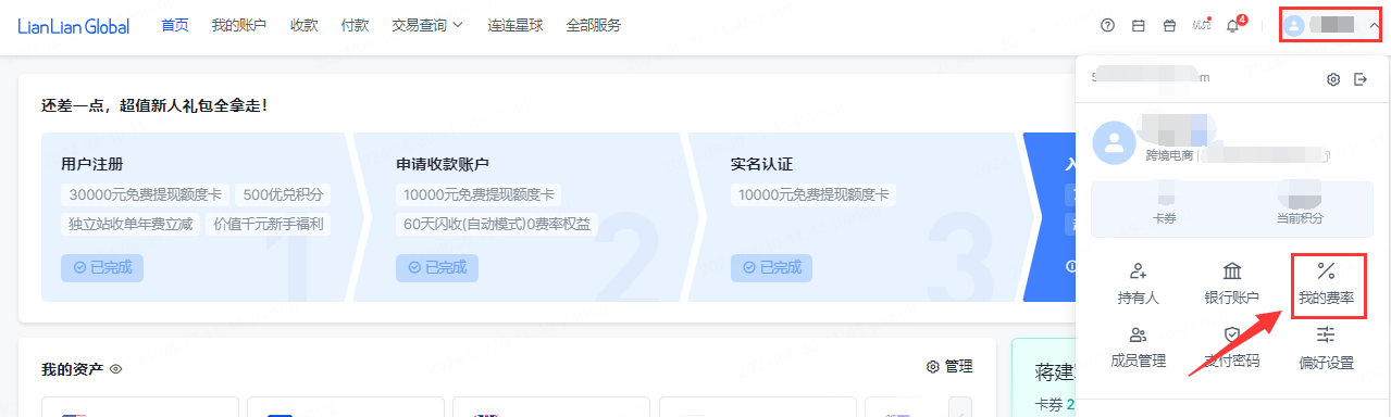 2您好,您可点击登录连连用户站,点击【个人中心】-【我的费率】,即可查看您目前的提现手续费费率。这里显示的是标准手续费率,如之前有参加活动获得费率卡、额度卡,可以在发起提现时选择费率卡或额度卡进行抵扣。