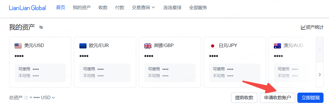 第2步:用户后台首页点击【申请收款账户】入口见如下截图展示: