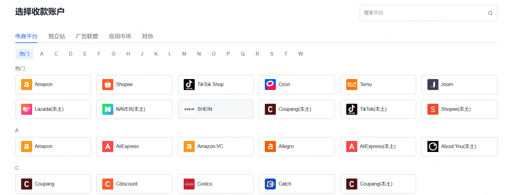 第3步:选择需要收款的平台可选【电商平台】、【独立站】、【广告联盟】、【应用市场】、【其他】