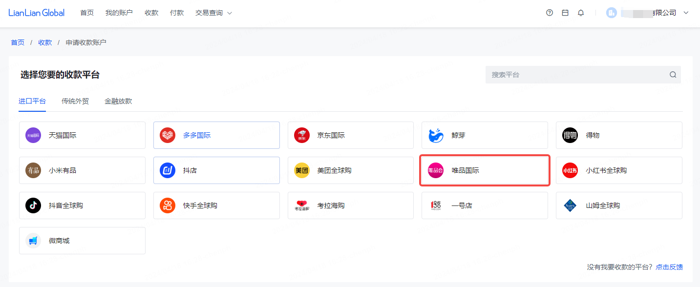 Step2:选择需要开通收款账户的电商平台-唯品国际,并填写相应店铺信息:
