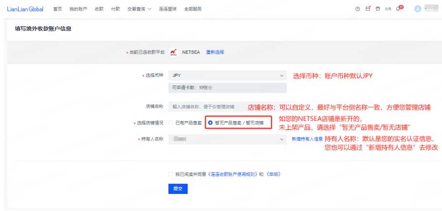 3.1 如您的NETSEA店铺是新开的,未上架产品,请选择【暂无产品售卖/暂无店铺】申请境外收款账户。