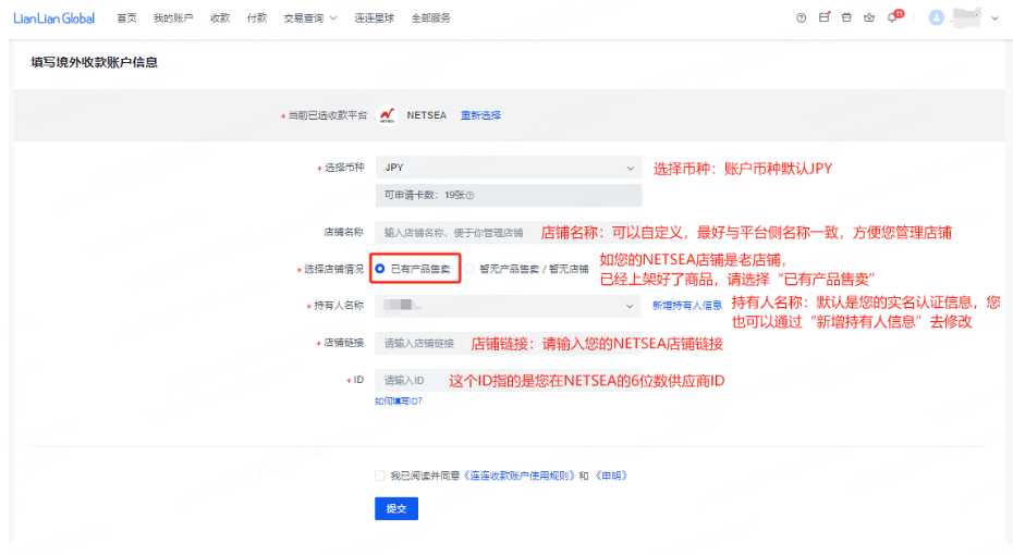 3. 根据真实情况填写NETSEA店铺信息