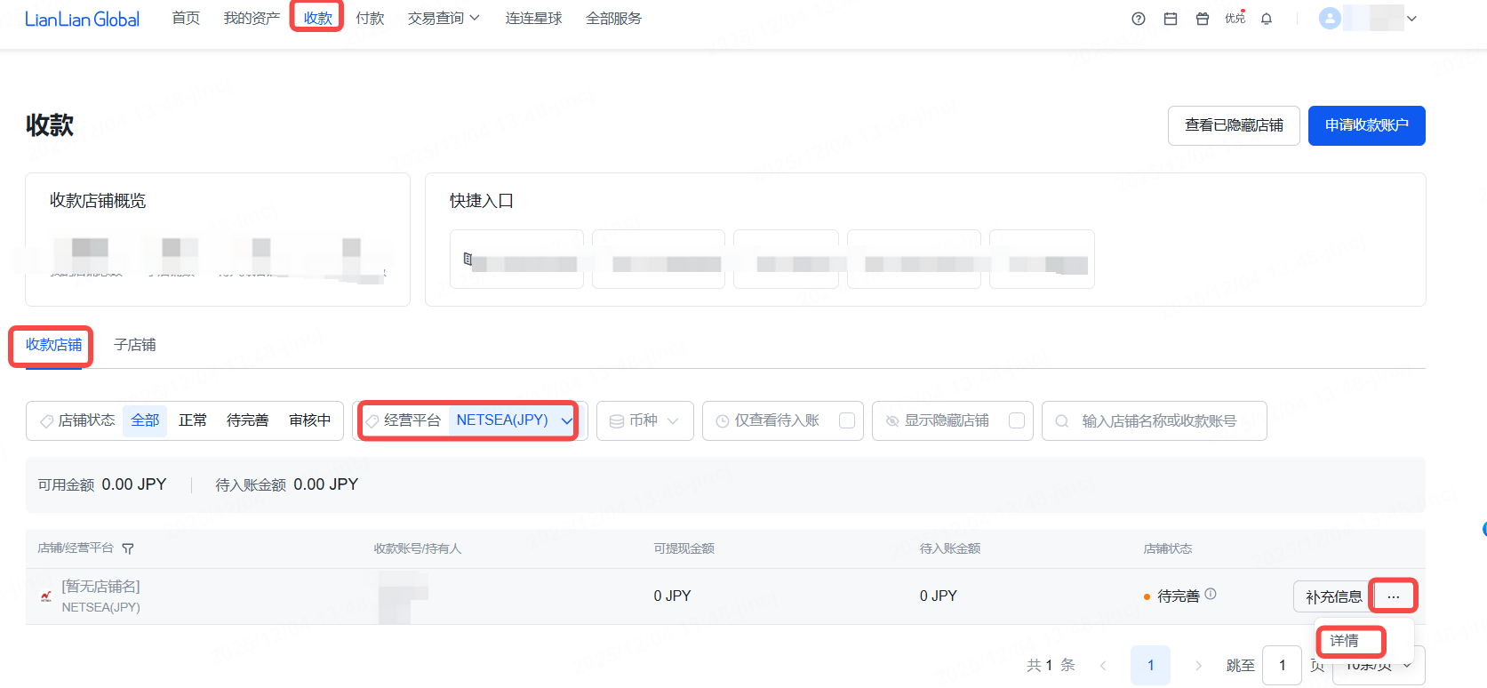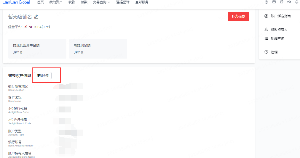 申请成功后,您可登陆LianLian Global后台,点击【收款】-经营平台选择【NETSEA】-点击【详情】,可查看/复制您的收款账户信息。