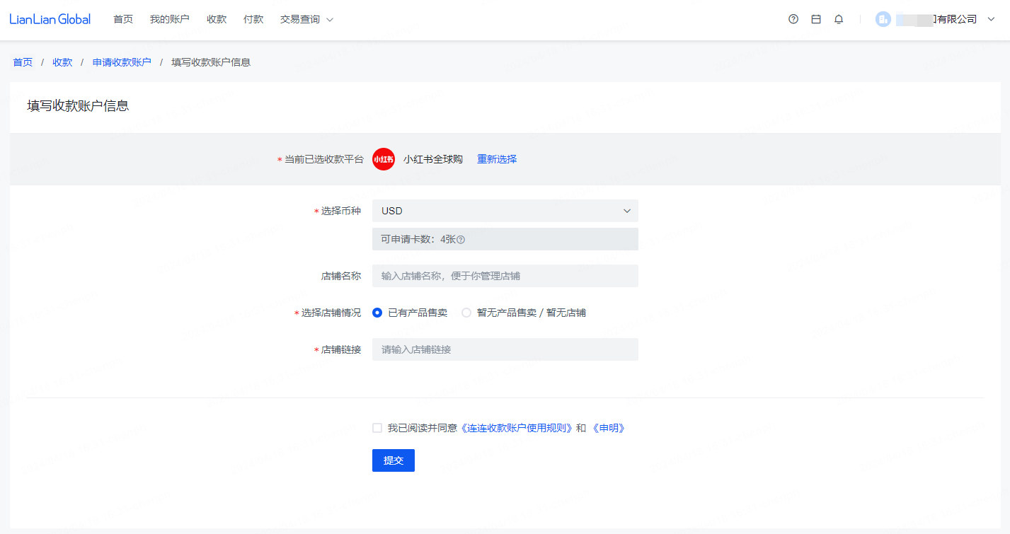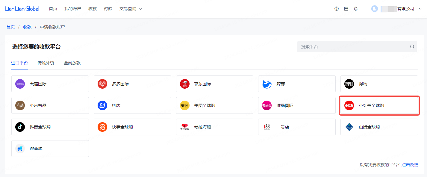Step2:选择需要开通收款账户的电商平台-小红书全球购,并填写相应店铺信息: