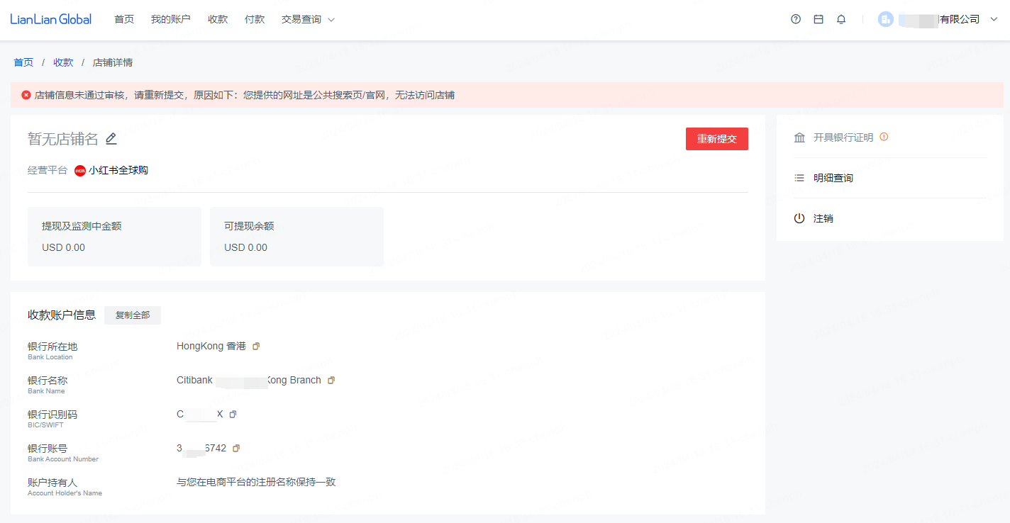 Step3:确认店铺信息无误后点击提交,即可发放和查看收款账户信息,提交的店铺信息最快1个工作日内完成审核。