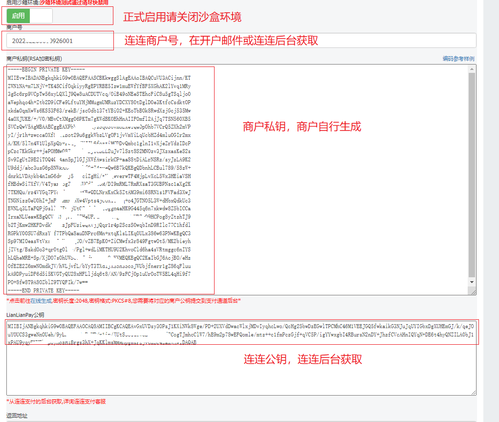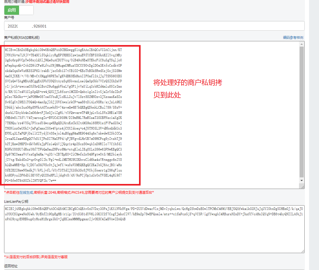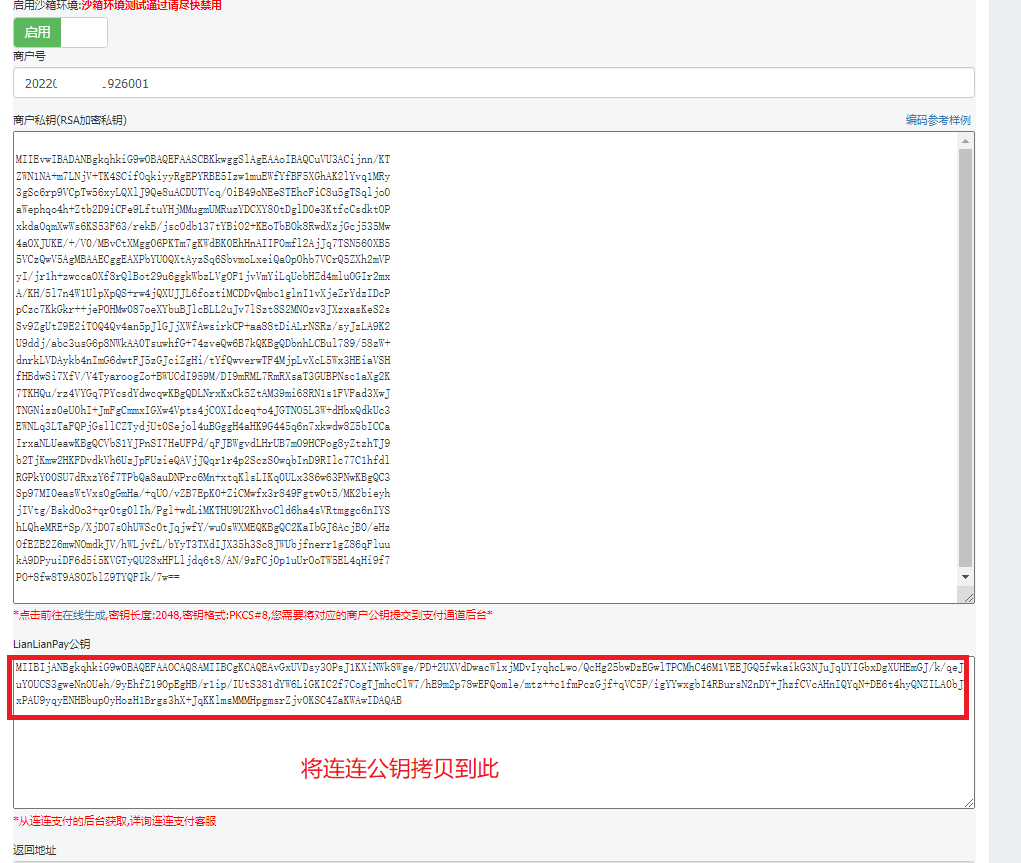 4、连连公钥配置:将连连全球收单商户后台【开发者管理】-【 密钥 配置】-> LianLianPay公钥 复制到万全云后台支付配置页面LianLianPay公钥中
