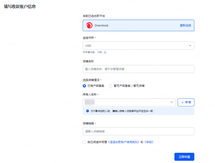 二、申请Overstock连连收款账户