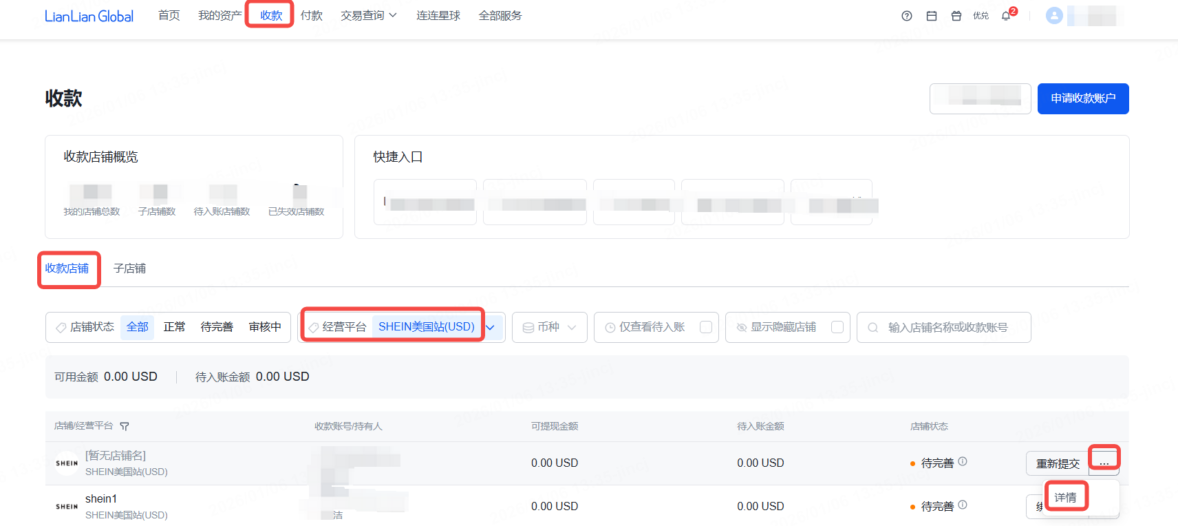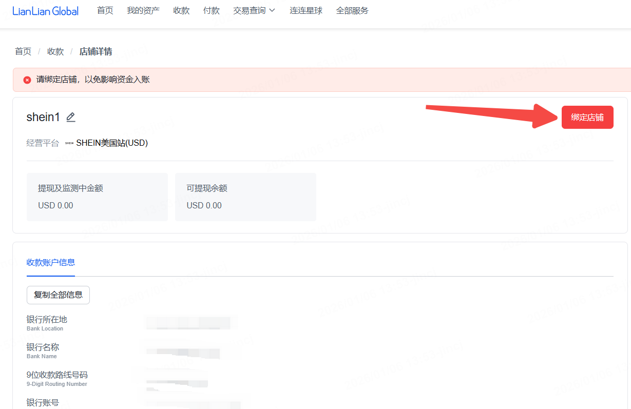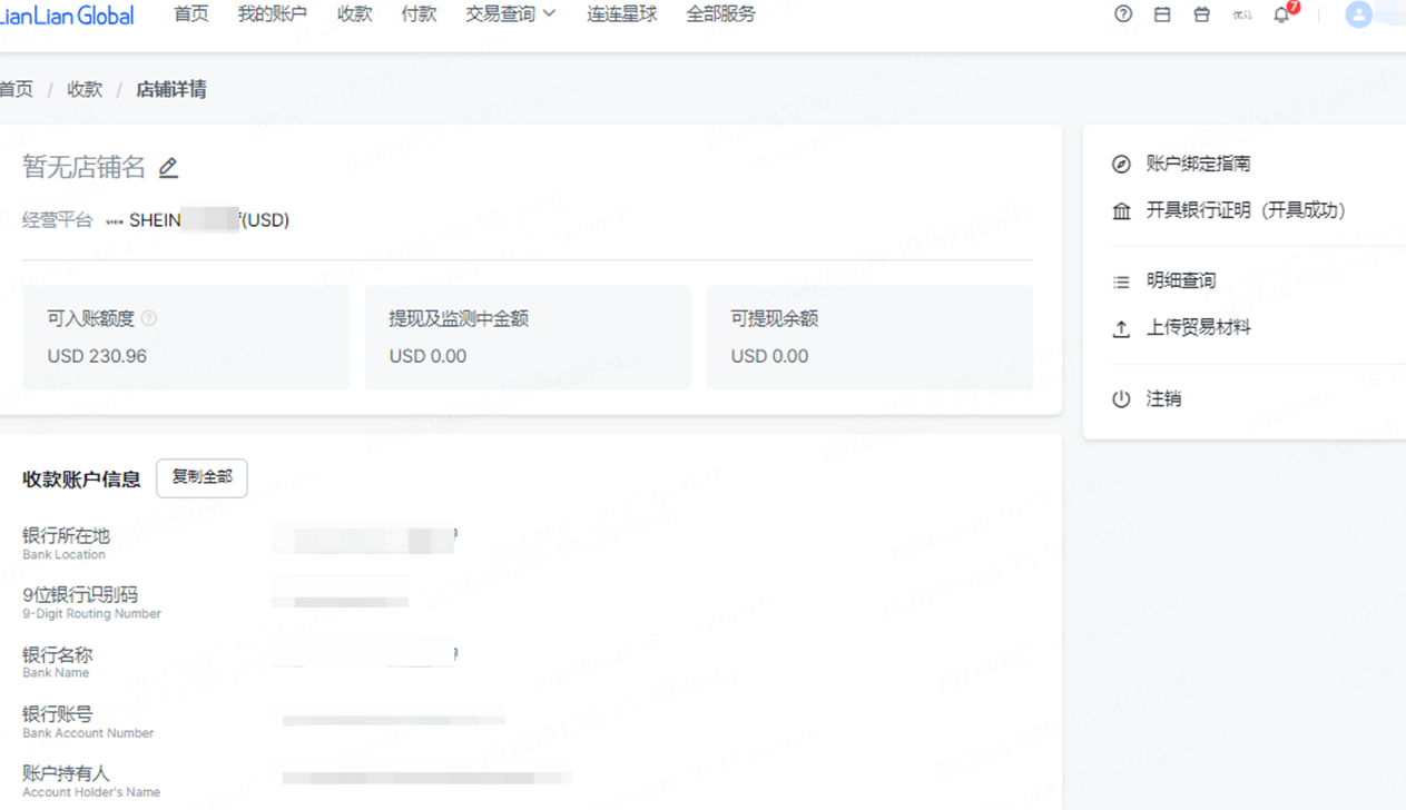 进入连连首页——【收款】,选择SHEIN对应的经营平台后,可点击【详情】查看银行账号