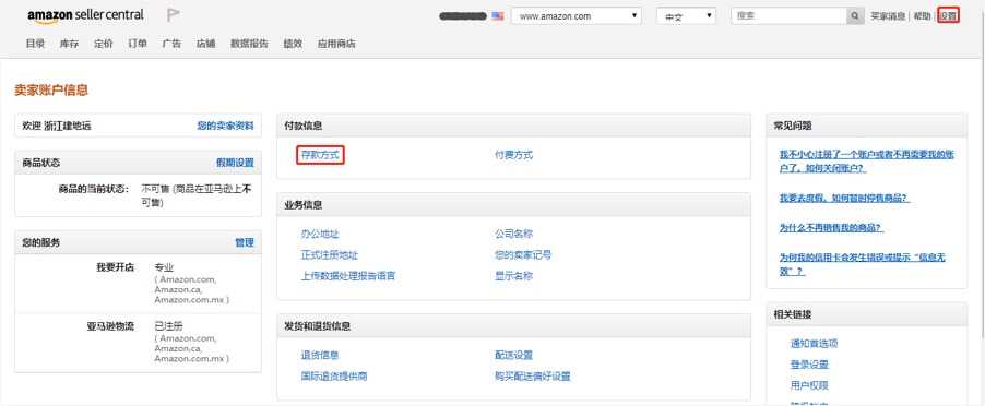 1.登录亚马逊卖家后台,点击右上角的“设置”后,点击中间的“存款方式”。