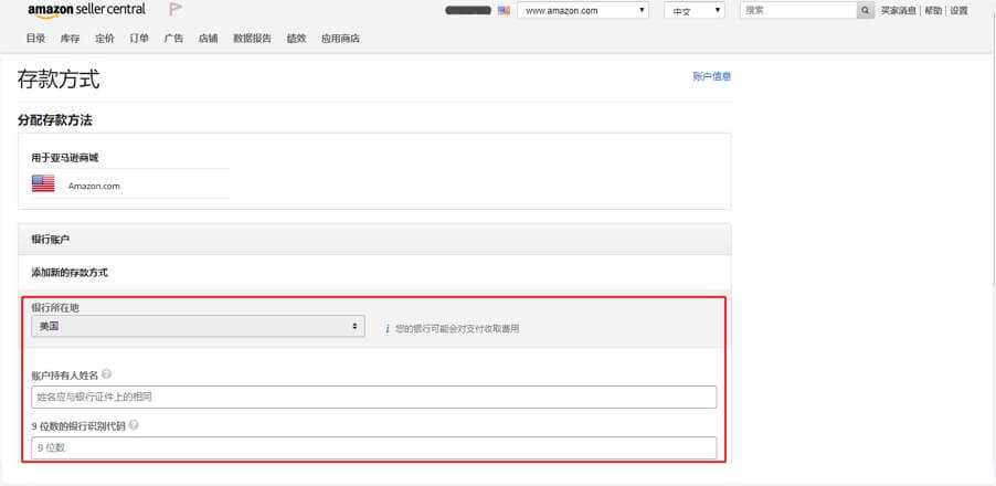 3.以亚马逊美国为例:参照收款账户详情页中的账户信息,选择银行所在地(Bank Country),填入账户持有人姓名(Account Holder’s Name)、9位数的银行识别代码(9-Digit Routing Number)、银行账号(Bank Account Number)。最后点击“设置存款方式”。