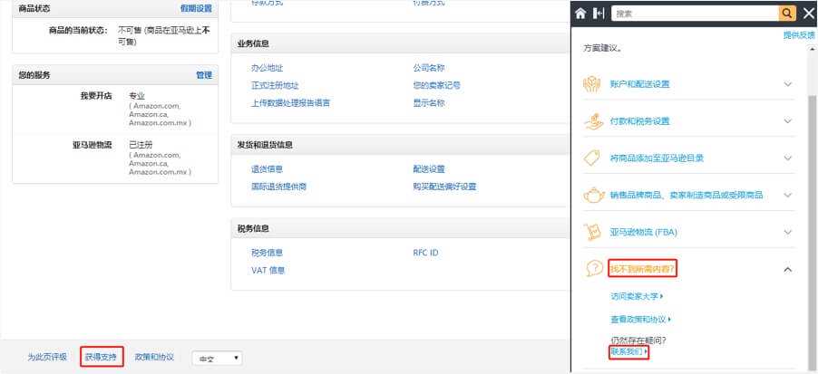 为了防止在更换账号的过程中,被亚马逊的风控误判为黑客盗取账号,影响店铺正常经营,用户可以在更换账号之前,在亚马逊商家后台开客服case,告知客服近期准备更换后台账号,提前做好系统报备。用户可进入亚马逊商家后台,点击页面底部的“获取支持”,在右侧弹出页面点击“找不到所需内容?”—“联系我们”。