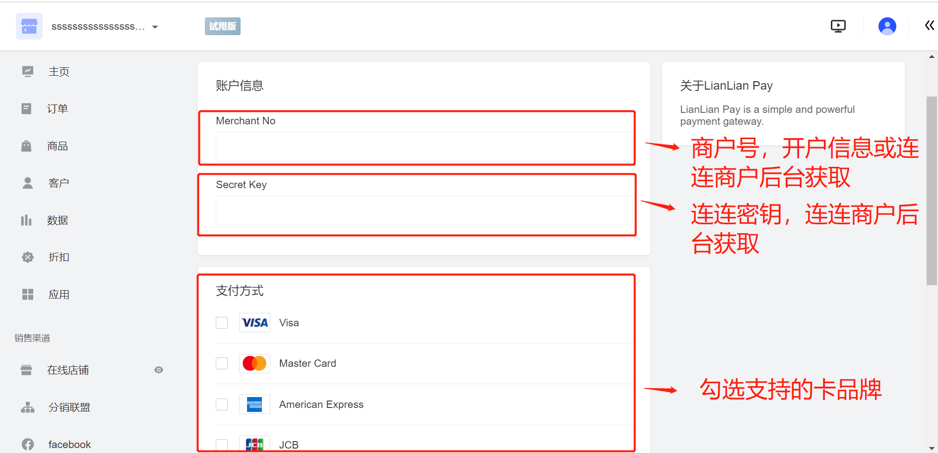 2、在配置页面填写 商户号 Merchant No,连连密钥 Secret Key,并选择支持的卡品牌。点击查看商户号和支付密钥如何获取,