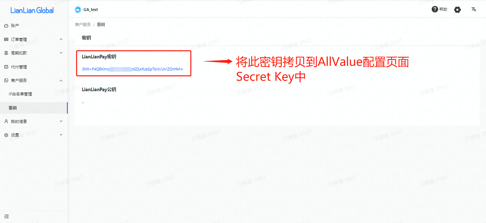 3、将商户号和LianLianPay密钥配置到AllValue后台