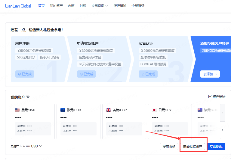 3.1、点击“申请收款账户”