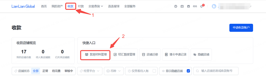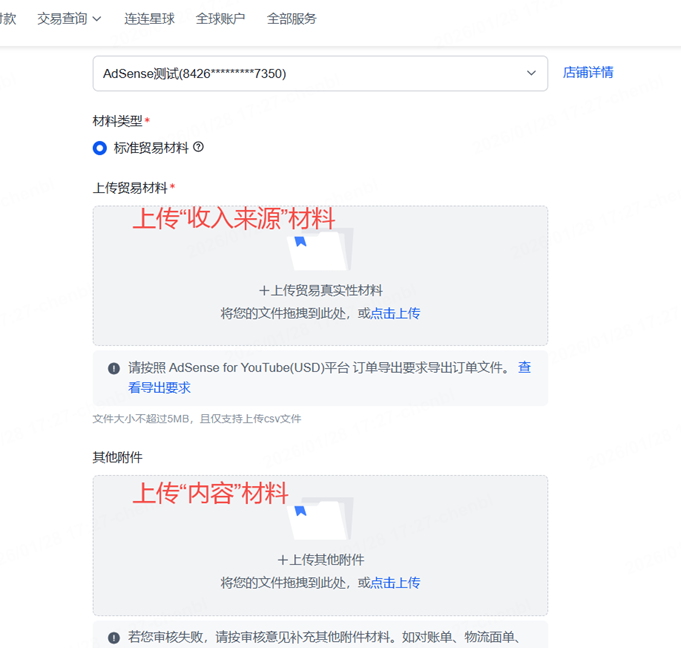 登陆连连用户站-点击【收款】-选择【贸易材料管理】-选择"Google Adsense Youtube"平台-上传贸易材料。