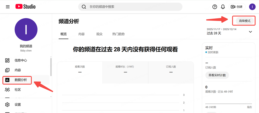 ①进入Youtube后台点击【数据分析】-点击【高级模式】进入数据看板