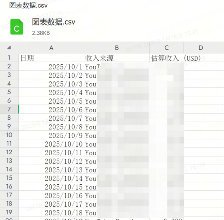 【数据分析】-【高级模式】,细分选择“收入来源”的详细数据数据,点击下载。材料格式需为CSV。