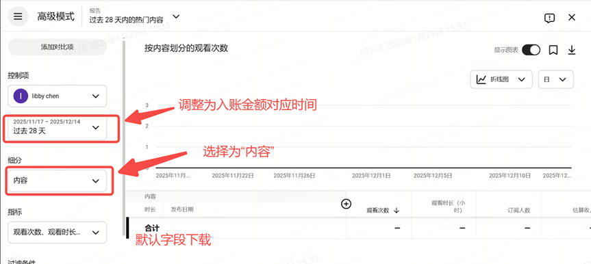 【数据分析】-【高级模式】,细分选择“内容”的详细数据数据,点击下载。格式需为压缩文件。