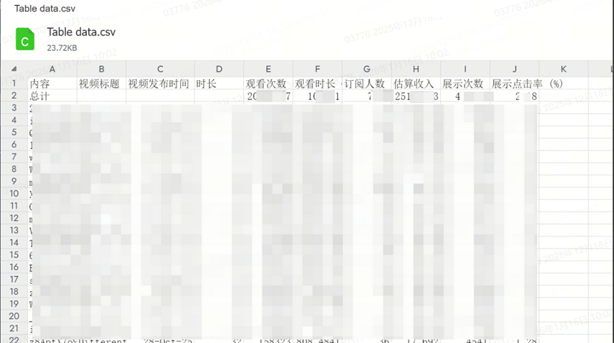 分别为YOUTUBE后台【数据分析】中的【细分】为“收入来源”和“内容”的两份材料。具体下载方式如下: