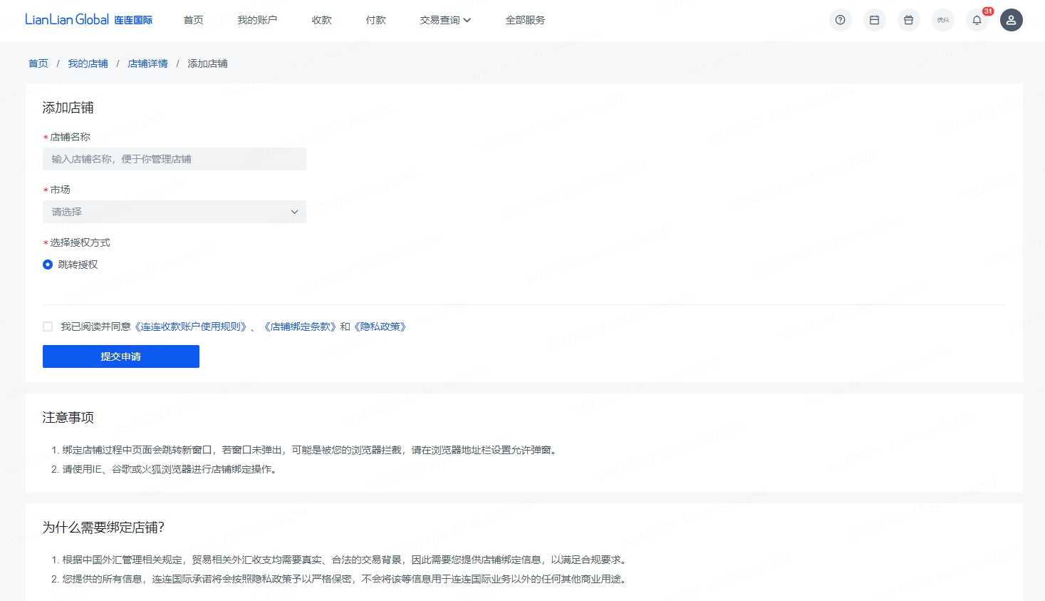 2. 输入店铺名称、选择市场后进行跳转授权,授权成功后您的收款账户才会添加成功,系统会自动拉取贸易材料,无需您再手动上传贸易材料。