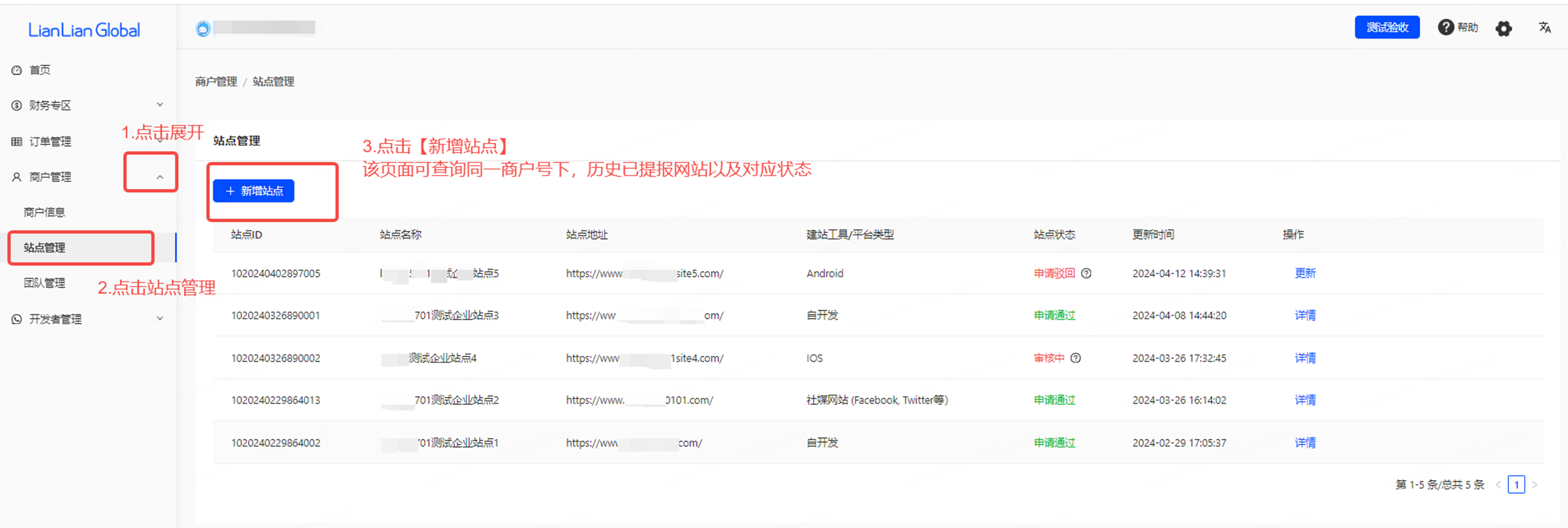 2、点击左边菜单栏【商户管理】——【站点管理】,页面可查看同一商户号中历史已提交的网站信息以及具体状态。点击【新增站点】,跳转至提交新网站信息接入页面填写需申请网站信息并提交审核