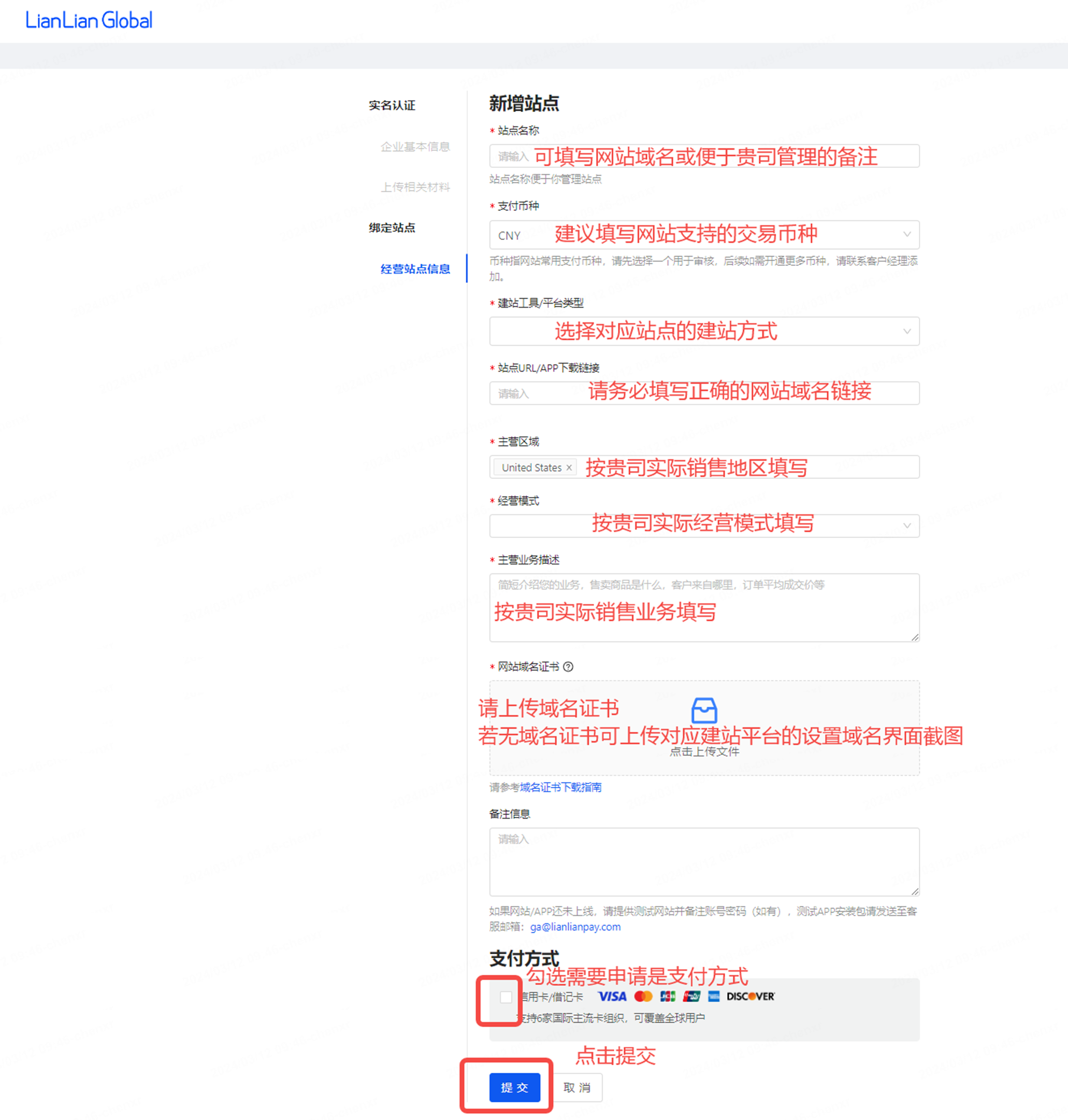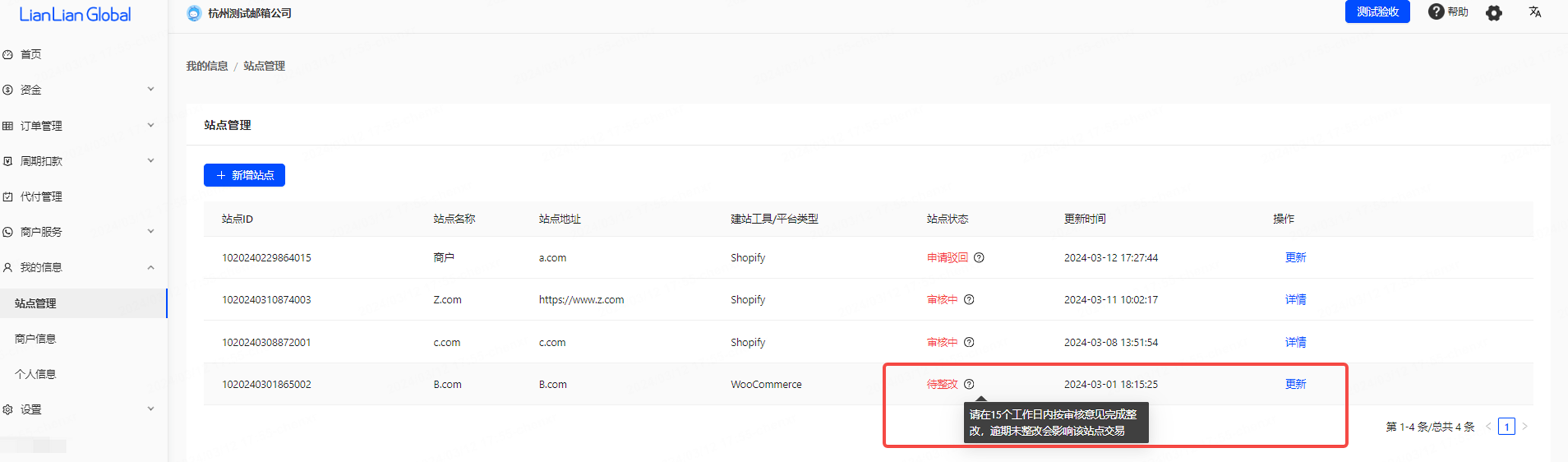 3、提交新网站接入申请之后,若有相关审核反馈需更新材料,请您务必关注邮件通知或及时登录连连全球商户站后台-【商户信息】-【站点管理】-点击【更新】查看审核反馈,并按审核反馈意见修改网站内容后,重新提交网站信息进行审核。