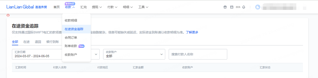 请在上方导航栏中依次点击「收款」、选择「在途资金追踪」查询收款资金的汇款情况。
