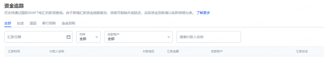 请注意:目前我们仅支持开户机构为摩根大通全球收款账户、星展全球收款账户的资金追踪查询功能,请以您在资金追踪页面可以查询到的信息为准,如您的某笔交易无追踪信息,则可能是我们暂未支持。