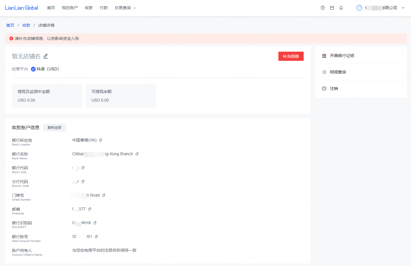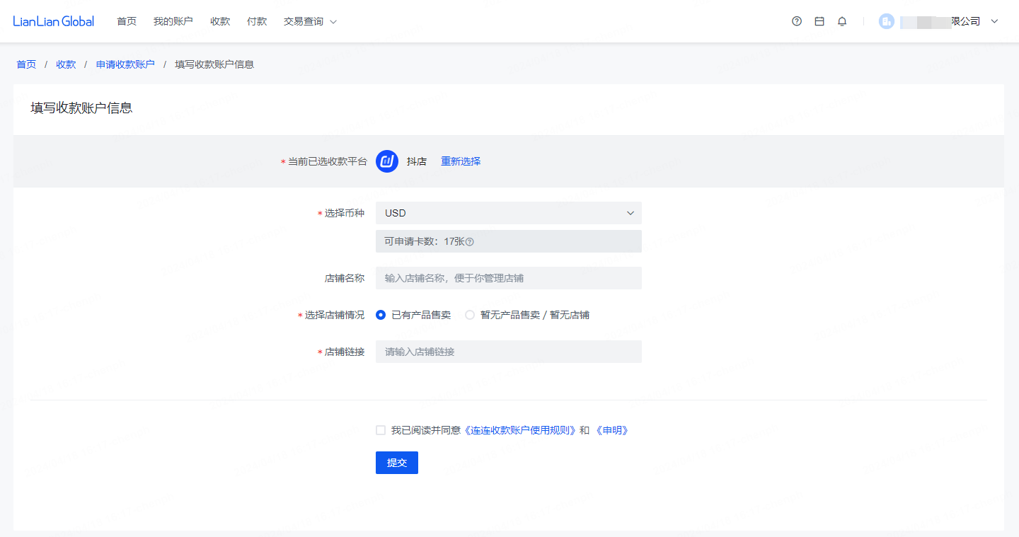 Step3:确认店铺信息无误后点击提交,即可发放和查看收款账户信息,提交的店铺信息最快1个工作日内完成审核。