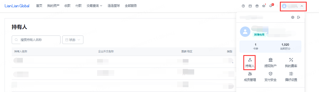 操作路径:登录连连国际官网-右上角“个人中心”-持有人-添加持有人。
