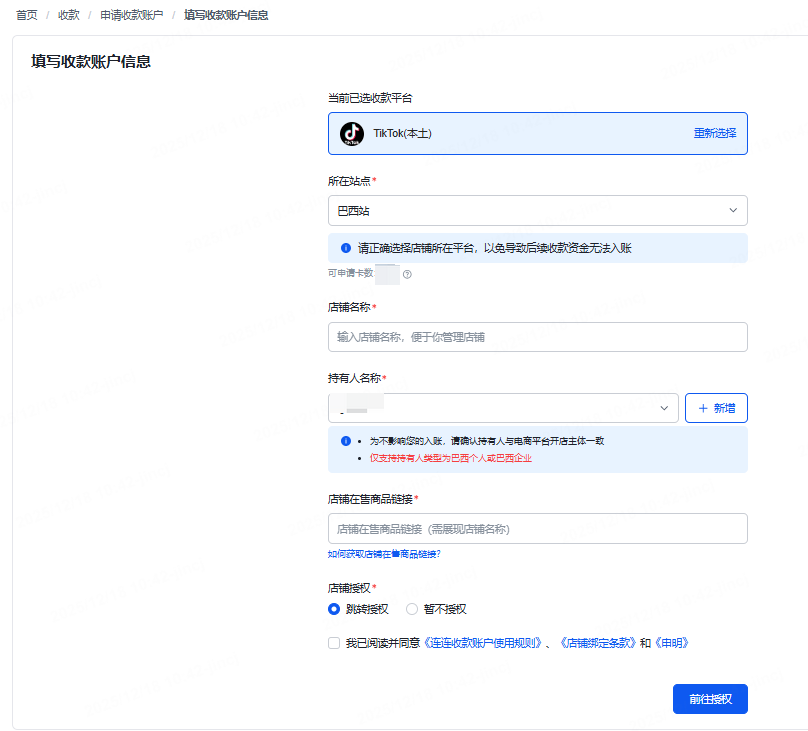 如未申请收款账户,可在申请收款账户时进行店铺授权