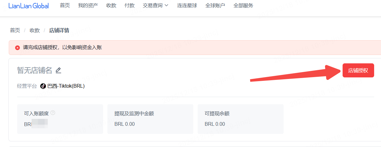 如果已在连连申请收款账户未授权店铺的,可在连连官网-收款-对应店铺的店铺详情页-店铺授权