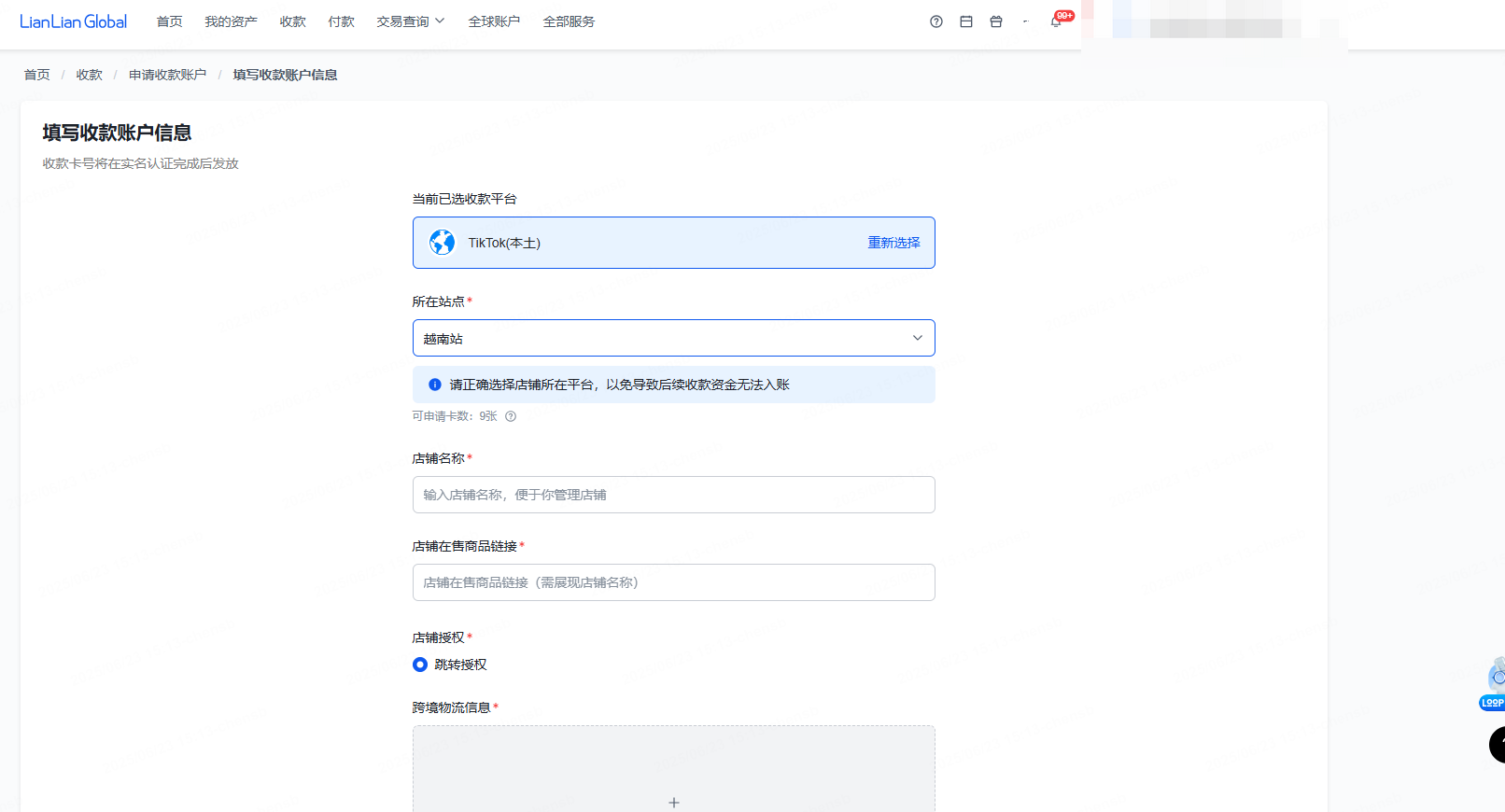 温馨提醒:绑定收款账户环节,一个收款账户只能绑定一个店铺。