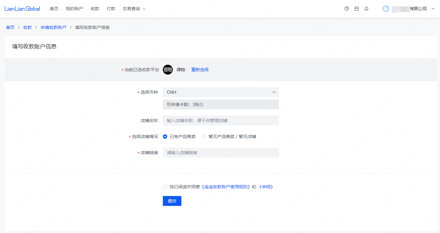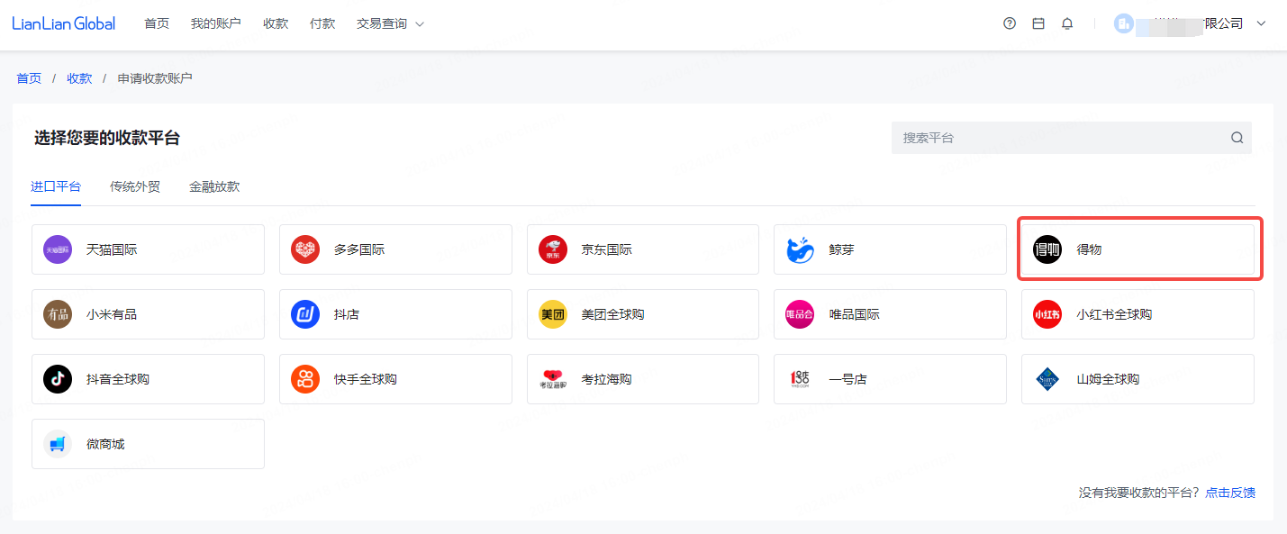 Step2:选择需要开通收款账户的电商平台-得物,并填写相应店铺信息: