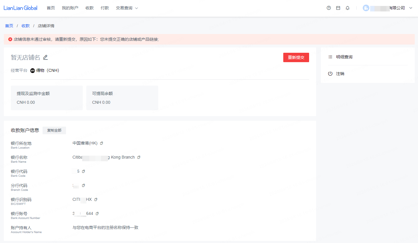 Step3:确认店铺信息无误后点击提交,即可发放和查看收款账户信息,提交的店铺信息最快1个工作日内完成审核。
