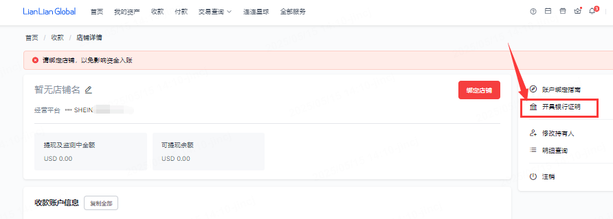 2银行证明信(收款信息确认函):跨境官网首页-收款-收款店铺-详情-收款账户信息页(右侧)-开具银行证明。