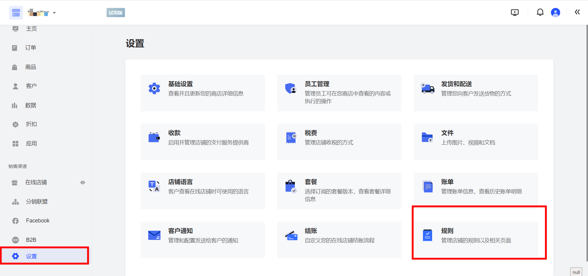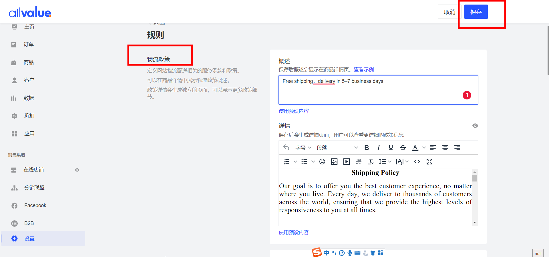 登录AllValue 后台,点击【设置】,点击【规则】,右侧出现服务条款,物流政策等条款信息,可在对应的条款编辑框中修改相应条款内容,点击保存即可