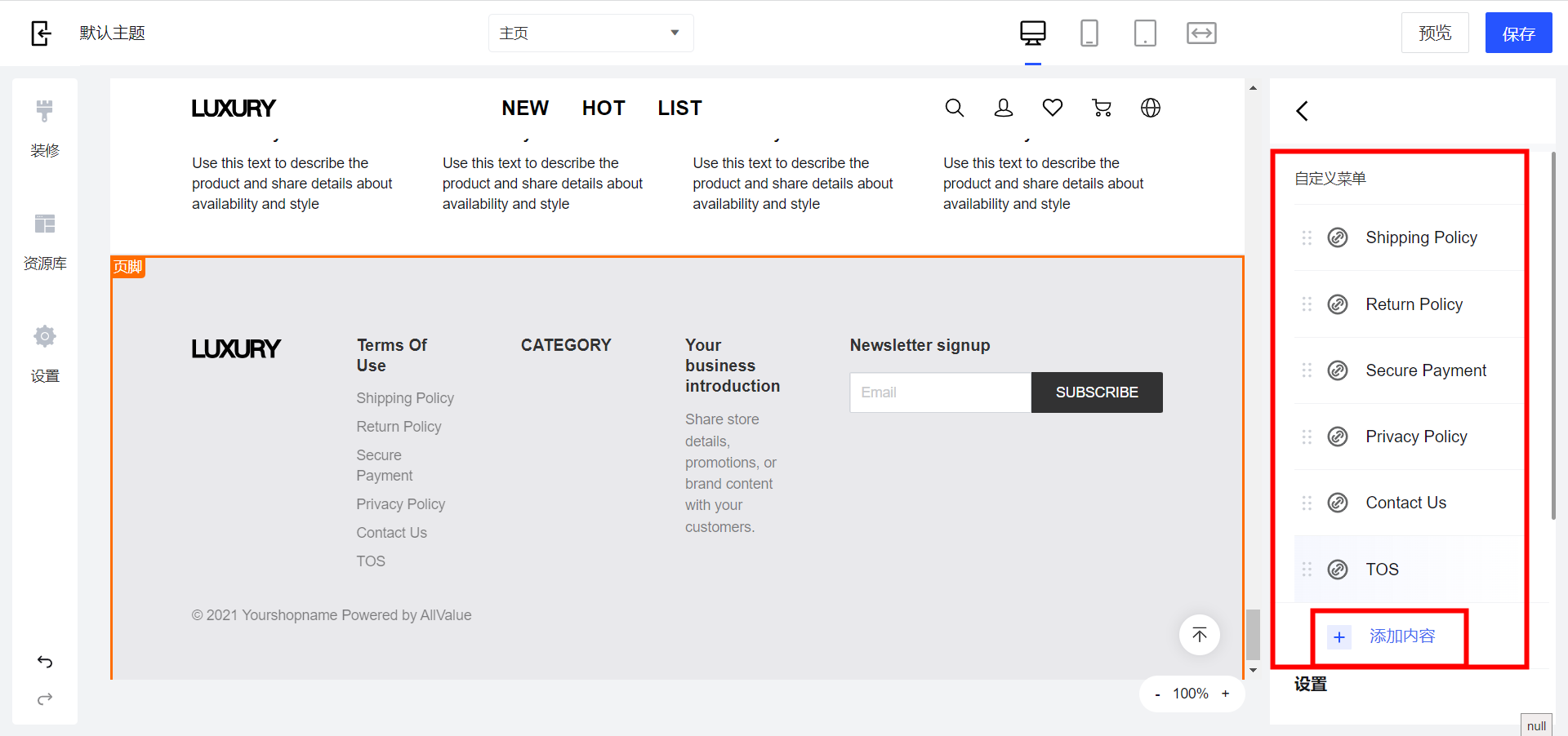 登录您的AllValue 后台,点击【在线商店】,点击【主题】,点击【编辑】,选中页脚模块,最右侧界面出现页脚菜单模块,点击【Term of use】,出现自定义菜单界面,点击需修改的条款可更换标题及对应的链接。如需新增,点击【添加内容】可增加新的条款内容